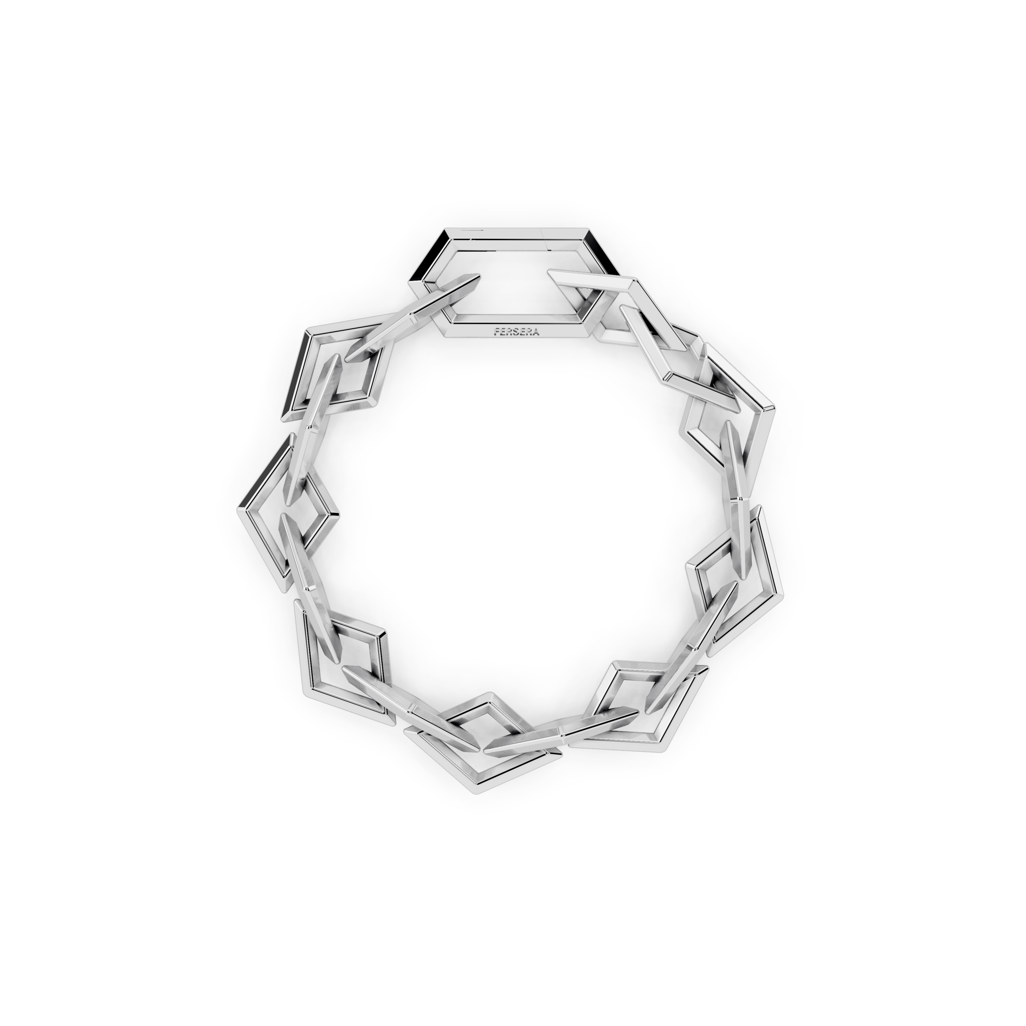 The Sculptor’s Bracelet is a dynamic composition of angular shapes and architectural interlocks. Each link, sculpted in 925 silver plated with palladium and rhodium, reflects light like a suspended architectural element, evoking a refined industrial aesthetic. A sculptural piece of jewelry designed to endure over time, with a bold yet perfectly balanced structure.