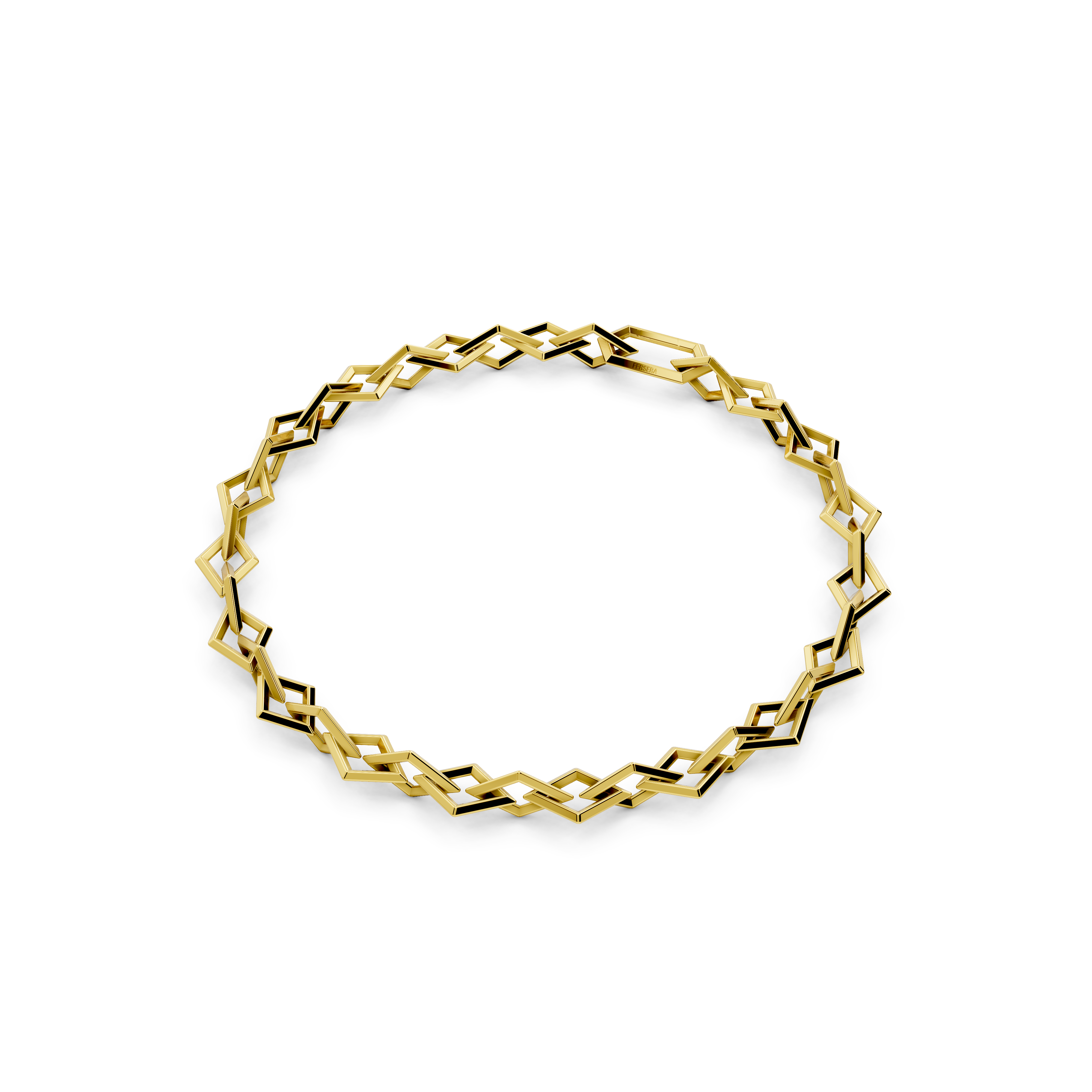 The Sculptor’s Necklace is a dynamic construction of angular shapes and architectural interlocks. Each link, sculpted in 925 silver plated with 18kt gold, palladium, and rhodium, reflects light like a suspended architectural element, evoking a refined industrial aesthetic. A sculptural piece of jewelry designed to stand the test of time, with a bold yet perfectly balanced structure.