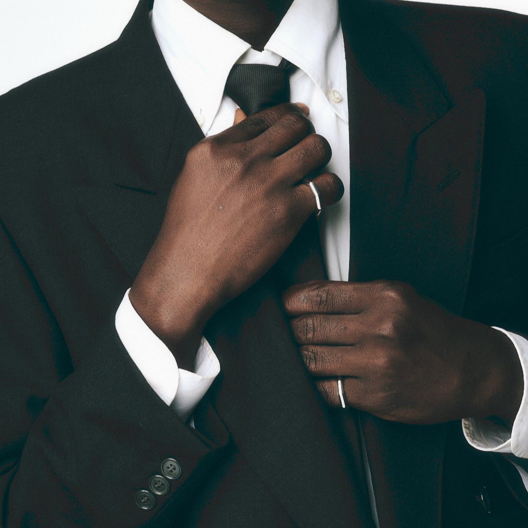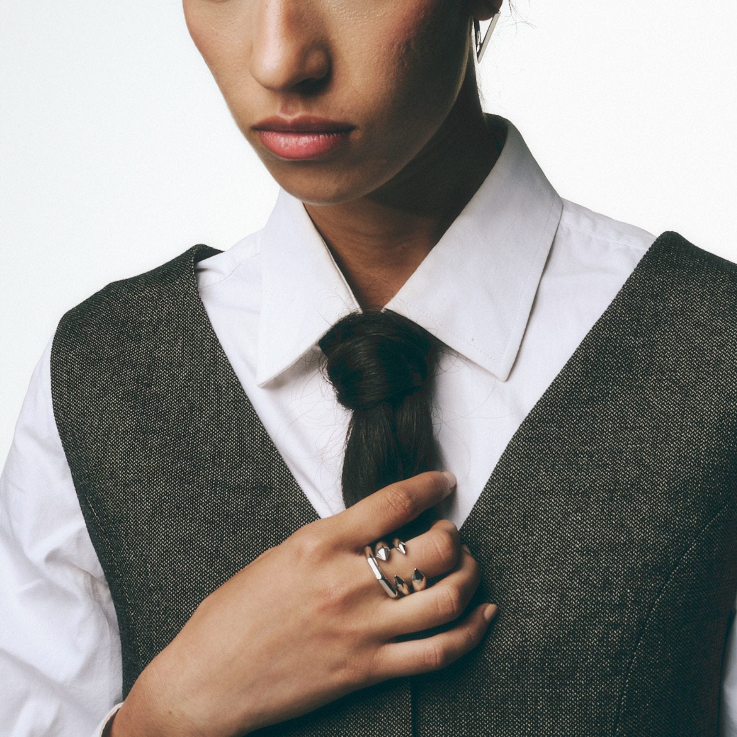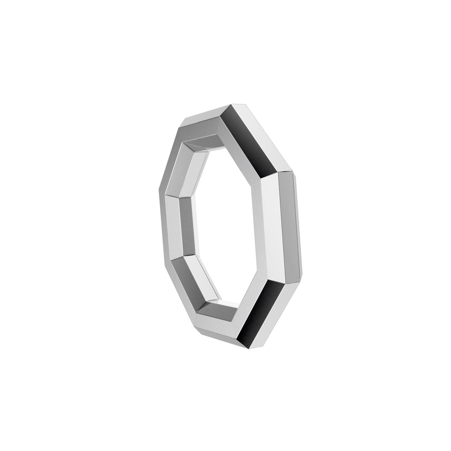 ring in solid silver with a polished finish. A pure and bold octagonal shape, inspired by the rational language of architecture and sculpture. Its compact volume and clean lines make it a minimalist statement for contemporary hands.